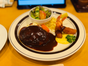 ランチのブラックボードの前でしばらく悩んだけど、ひよってハンバーグランチ