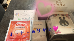 バレンタインのお返しのGODIVAのラブブのチョコとお手紙と蒸気アイマスクと入浴剤🩷こう言う場所でしてもらった事なくて