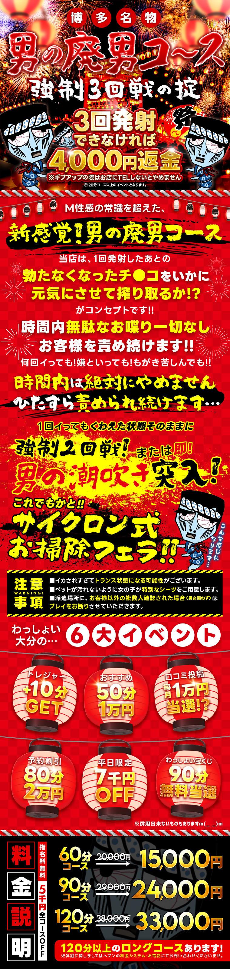 別府市 デリヘル わっしょい☆元祖廃男コース別府店 - 料金情報 電話: 080-8379-9439 営業時間: START ~ LAST